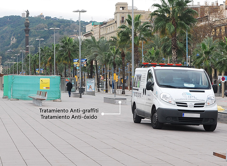 En el Paseo de Colón, de Barcelona, el Plan Anti Vandálico se despliega sobre todos los paramentos verticales y los elementos de mobiliario urbano.